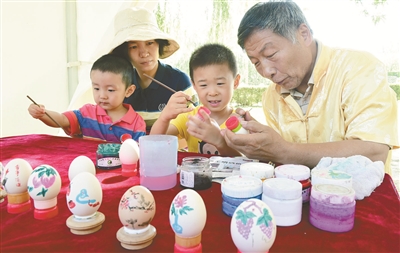 | 在“花开丰台”端午文化游园会上,“编五彩绳”、“雄黄画额”、“彩蛋绘制”、“吹糖人”、“龙凤字”等10项端午民俗技艺现场展示,给游客带来了原汁原味的民俗体验。 |