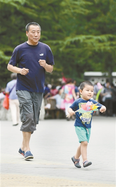 | ◀端午小长假,在工体人们以各种方式开展健康运动。您瞧,这爷孙俩跑得真开心! |