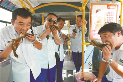 | 端午节这天,公交客运八分公司三队早班车职工,在车厢相互品尝自己从家中带来的药膳粽子,分享快乐,祈福健康。 |