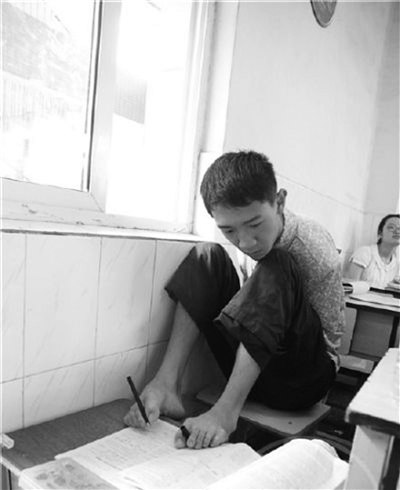 “无臂考生”二度高考交出603分答卷。备受关注的攀枝花“无臂考生”彭超,高考分数603分,比预估分数高出13分。他是今年四川首批特殊考生照顾政策的受益者之一,获得45分钟的语文延时,并按时写完答卷。(6月22日《华西都市报》)