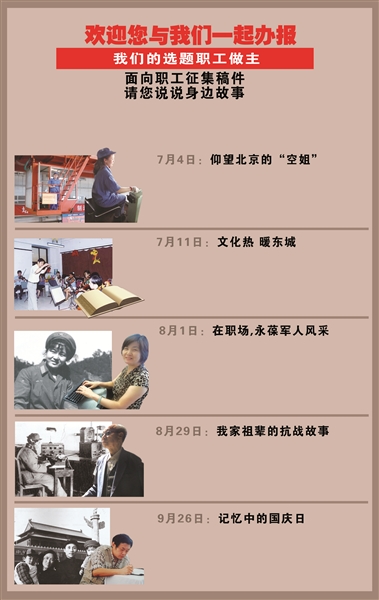 一张与职工贴心的报纸,应该是一个职工用来倾诉和交流的平台。北京几百万职工中有太多的故事和报道素材,为此我们自本期开始,不断的向广大职工读者公布我们的重点报道选题,提前征集劳动者自身或发生在身边的故事,将这些故事传播给更多的职工,传播给社会,弘扬正能量,高歌劳动光荣。