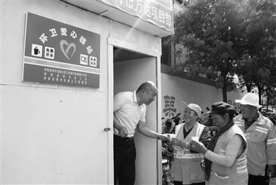 环卫工爱心驿站的成立得到当地城市环境卫生管理局领导们的支持,在揭牌当天,环境卫生管理局的领导们为片区的环卫工人们献上了一杯热水,表达了对环卫工人最真挚的敬意与感谢。