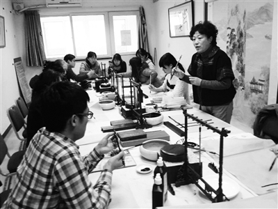 毛笔、毡布、纸张……上周五中午,在位于北京市工艺美术高级技工学校的这间“园丁画苑”书画室中,张跃和其他的几位老师正在跟国画老师,享受传统艺术带来的乐趣。