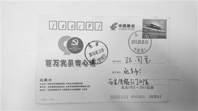 在我的办公桌玻璃板下,始终存放着一张非常有纪念意义的明信片,无论工作岗位多次转换,但这张明信片一直陪伴着我。这张设计独特的明信片正面印有鲜艳的五星红旗和北大红楼,背面最有意义的就是盖着“中南海1”的邮戳,上面标注着:“2011.07.01.11”。每次看到它,我都会情不自禁想起四年前那次难忘的参观。