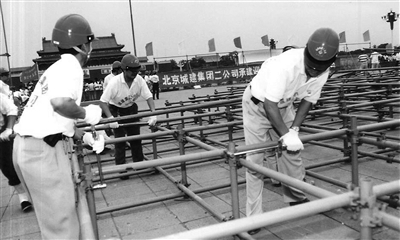 虽然工程没有什么技术含量,但时间仅仅只有六天的功夫,太短了。为保证香港顺利回归,不出现任何质量和安全问题,公司领导亲自挂率靠前指挥,公司各单位通力合作,要人出人,要物出物,都为完成这一历史性工程任务兴奋不已。500名工人火速进场后,顶着火辣辣的太阳昼夜施工,个个争分夺秒,汗流浃背。运送架子管的……搭架子的,人人心里喜气洋洋,干劲倍增。六天后一个简约、结实、庄重的舞台如期竣工了。