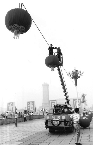 6月30日晚,首都10万群众在天安门举行隆重的庆祝活动,歌声、欢呼声、鼓声响彻云霄;灯火、红旗、标语、烟花汇成红色的海洋……在他们活动的脚下,就是我们北京城建二公司500名工人冒酷暑为庆祝香港回归搭建的活动舞台。