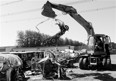 昨天上午,朝阳警方在黑庄户地区对 “黑摩的”开展集中销毁行动。随着现场执法人员的一声令下,两辆大型铲车挥动黄色大臂,向一排排“黑摩的”砸去。“咔咔”几声巨响后,近百辆“黑摩的”变成一堆废铁。据介绍,朝阳警方会同区城管、交通等部门在清理整治过程中,采取联勤联动、综合执法等手段,自今年上半年以来,共收缴“黑摩的”2800余辆。本报记者 于佳 摄影报道