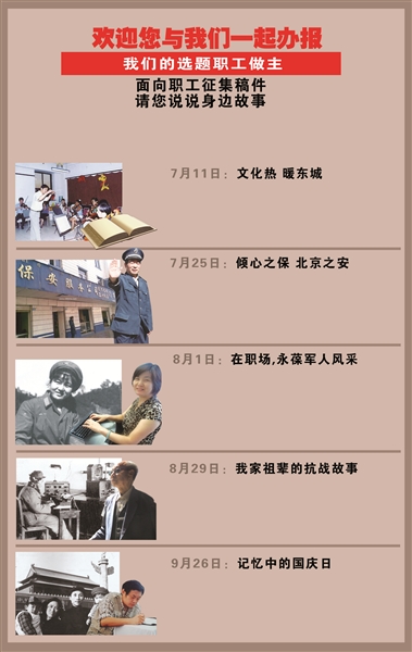 一张与职工贴心的报纸,应该是一个职工用来倾诉和交流的平台。北京几百万职工中有太多的故事和报道素材,为此我们自本期开始,不断的向广大职工读者公布我们的重点报道选题,提前征集劳动者自身或发生在身边的故事,将这些故事传播给更多的职工,传播给社会,弘扬正能量,高歌劳动光荣。
