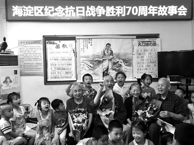 本报讯(记者 白莹)7月6日下午,海淀区纪念世界反法西斯战争暨抗日战争胜利70周年故事会在万寿路街道复兴路24号社区举办。本次活动以“铭记革命历史传承红色精神”为主题,国歌《义勇军进行曲》作曲者聂耳的侄女聂春华、将军后代高凌与91岁的抗战老战士张资义来到现场,与小朋友们分享了国歌背后的故事及他们亲身经历或父辈经历的革命故事。