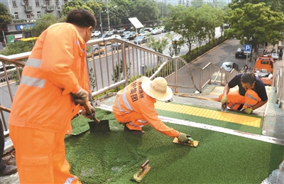 昨天,北京市政路桥养护集团的职工分成小组,分别对全市791座过街天桥集中进行修缮养护。在朝阳门小街过街天桥上施工的负责人介绍,从现在起,京城的气温将逐步走高,高空桥面的温度40度以上是常事,师傅们不惧酷热坚守岗位,就是要确保市民们的出行安全和畅通。