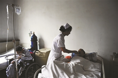 “来,慢慢的,我帮您喂点水啊。”边说着朱玉玲边将一位病人从轮椅上搀起,然后和一位护工将老人扶到病床边,“不着急啊,慢慢的躺。”因为病情特殊,这位病人每次都需要卧床后才能喝水。