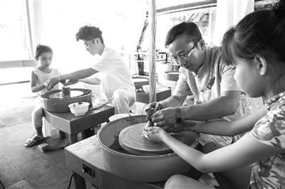 昨天,景山公园第八届荷花盆景艺术展开幕。景德镇精品陶瓷也首次走进景山公园,除了展示仿古陶瓷外,景德镇的专家们还手把手教学生们制作陶瓷,以此丰富学生们的暑期生活,感受一块泥土是如何通过自己双手的拉坯、塑型、彩绘、烧制成为一件工艺品。本报记者 邱勇 摄影报道