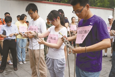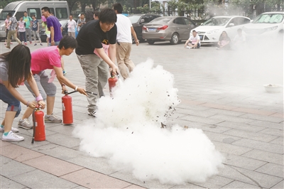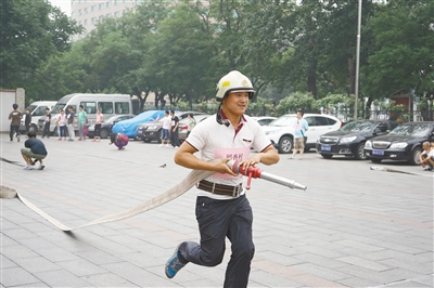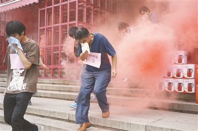 6月29日上午,位于东城区的崇文工人文化宫浓烟弥漫,人们用手帕捂住嘴,弯着腰迅速有序地逃离现场。这是东城区总工会2015年职工消防安全运动会上的一幕,目的是让职工们体验在紧急情况如何保护好自己,并及时逃生。
