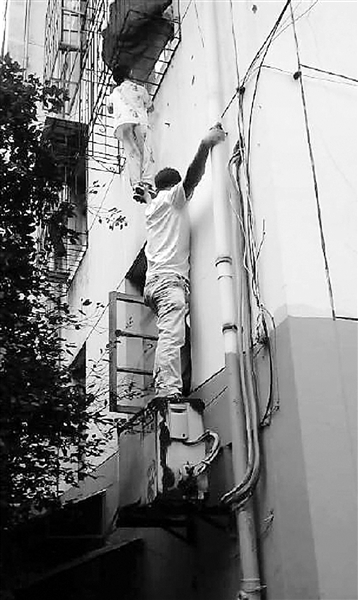 12日上午9点左右,海宁市区相院里小区11幢2楼保笼中挂着6岁左右的男孩子,头卡在铁栅中间,双手死死抓着铁条。同楼一阿姨发现后,立马报警。这时,一位40岁左右的男子,二话没说,立刻爬到男孩下面的空调外机上,用头顶住男孩双脚20多分钟,直到男孩的父亲赶到,将孩子救下。(7月14日《钱江晚报》)