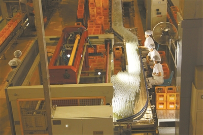 记者看到一箱箱北冰洋汽水从生产线上装箱,再送到货运车上,送到北京市的各个销售点,送到老百姓的手里,喝到老百姓的嘴里,爽到老百姓的心里。在北冰洋生产车间,记者亲眼目睹了北冰洋的生产流程和操作。该公司副经理、北冰洋汽水灌装线生产总监荣光告诉记者,现在的三条灌装线都在运转。他指着灌装老线对记者说:“这条线每小时750箱。”他又指着灌装新线对记者说:“这条线每小时1500箱。这两条线的人员都是24名,不同的是新线的运转速度更快,每小时比老线提高750箱,而且,新线是24小时不停地运转,即便是这样,还不能满足市场的需求。”据了解,这条新线是今年上半年刚刚投入使用的,就进入了北冰洋汽水灌装生产线的快速路。