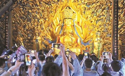 2015年6月13日,“重现金身”的大足石刻千手观音造像前聚满了参观者。这尊千手观音像完成于南宋期间,共有830只手臂,此前因砂岩开裂导致283只手臂残损,表面金箔卷曲脱落,此次历时近八年才修复完。