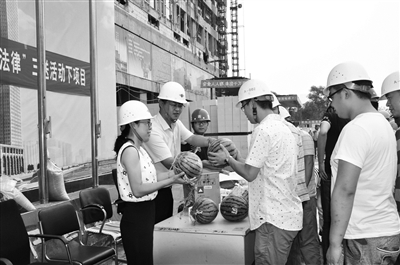 中建二局三公司天津分公司“送清凉,送安康,送法律”三送下项目活动近日启动。“三送”活动首站为水岸银座项目,公司领导为工人们送来了西瓜、绿豆、药品等慰问品,并赠送了安全生产职业培训、法律法规知识等光盘。本报记者 马超 通讯员 许本利 薛纪涛 摄影报道