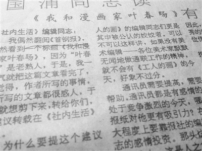 郭老在读后感中写道:“《社内生活》编辑同志:我偶然翻阅《首钢报》,突然看到一个标题为《我和漫画家叶春旸》,因为叶春旸是老熟人,于是,我一口气就把这篇文章看完了。我觉得,作者所写的事情,和所写的文章都很感人。于是,就想剪下来,转给你们,并建议转载在《社内生活》报上……”文中通过我和叶春旸编辑的交往,结合当时通联工作的现状,不仅对做编辑工作的同志有很深的启发,同时对基层的通讯员和业余作者,也有很好的启示作用。