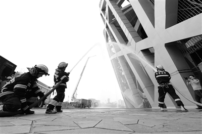 日前,北京公安消防总队为确保2015年田径世界锦标赛期间鸟巢消防安全,举行综合消防演练。演习模拟鸟巢5层北侧因排烟设施故障引发火灾,整个灭火过程持续10分钟,3名“被困人员”被救出,火被扑灭。本报记者 孙妍 摄影报道