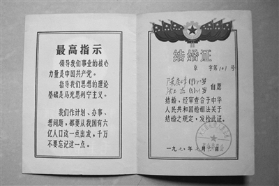 这两张结婚证被我妈妈保存得完好无损,正面上还印有金黄色毛主席像,头像下印有“伟大的导师 伟大的领袖 伟大的统帅 伟大的舵手 毛主席万岁”。打开结婚证,左面部分是毛主席的最高指示:领导我们事业的核心力量是中国共产党;指导我们思想的理论基础是马克思列宁主义。我们作计划、办事、想问题,都要从我国有六亿人口这一点出发,千万不要忘记这一点。结婚证的右面才是正题。上面写有京字第101号,张玉杰、陈殿峰自愿结婚,经审查合于中华人民共和国婚姻法关于结婚之规定,发给此证。日期是1970年7月6日。盖的印泥章为大兴县礼贤人民公社革命委员会。