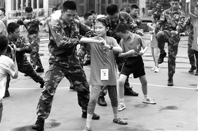 近日,西城区月坛街道社区报小记者在“八一”建军节到来之际走进驻国家广电总局武警部队,参加道德讲堂活动,感受榜样的力量。武警官兵邀请小记者们参观军营内务卫生,教他们叠“豆腐块”军被,小记者们还一招一式地和武警官兵学习擒拿拳。本报记者 孙妍 摄影报道