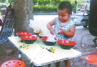 7月20日中午,在山东济南高新区舜华北路摆摊的刘振峰忙得一塌糊涂。一边,才两岁半的儿子刘春帅不时地帮着爸爸收拾碗筷、扔垃圾。不过很多人在笑过之后一方面感慨孩子懂事早,一方面也为他小小年纪就跟着出摊而感到有些心酸。