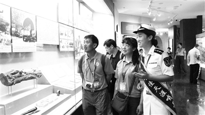 7月31日9时30分,12名身披“西沙十佳天涯哨兵” 绶带的水警区官兵集体向抗日战争纪念馆“铜墙铁壁”雕塑敬礼,然后陪同父母走进场馆,一起重温抗战历史,缅怀在抗日战争中牺牲的革命先辈。所到之处,群众争相与他们聊天、合影。河北姑娘林霖照完相后,激动地说要把相片珍藏起来,“他们是当代最可爱的人,今天的‘追星’经历让我难忘。”
