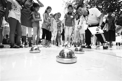 近日北海公园开展的冰上传统项目“冰蹴球”吸引了不少游客驻足。“冰蹴球”项目有着300年历史,主办方加以创新,在球底安装滚珠,使冰蹴球能够在平整的地面上滑行,解决了非冬季也能体验并开展冰蹴球活动。本报记者 孙妍 摄影报道