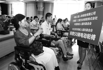 8月4日,中国残疾人福利基金会、中航三星人寿保险有限公司,北京市残疾人福利基金会共同举行了“集善工程——(爱之翼)助残行动”,中航三星人寿保险有限公司领导向北京市残疾人福利基金会捐赠50辆电动轮椅,将免费发放给本市困难的残疾人。截至目前中航三星人寿保险有限公司已向北京残疾人捐赠了488辆电动轮椅。本报记者 邱勇 摄影报道