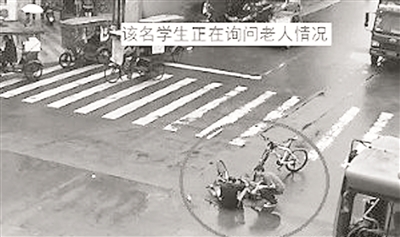 近日,四川彭州警方接到群众报警,在该市西北市街路口,一老人骑自行车过马路时摔倒,老人坚称是一名骑车学生将其撞倒。警方将老人带回警局就“被撞”一事做了进一步调查。在随后调取的监控画面显示,老人系自行不慎摔倒。一身穿红色短袖的男生经过,停车问候。不料,这名老人拉着该学生不让其走,周围聚着不少围观群众。经警方调取监控查明,整个过程中,老人系自己摔倒,学生并未与其碰撞。据了解,警方随后对老人进行了教育。(7月24日《北京晨报》)