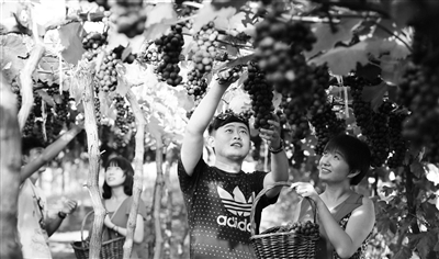 昨天,不少市民来到延庆县城旁的天葡庄园,采摘成熟的夏黑葡萄。天葡庄园是北京市延庆县第一家利用现代农业设施种植鲜食采摘葡萄的园区,共种植有夏黑、金手指等葡萄30余种,利用独特的温控科技和手段可以做到人们一年四季采摘新鲜的葡萄。本报记者 陈艺 摄影报道