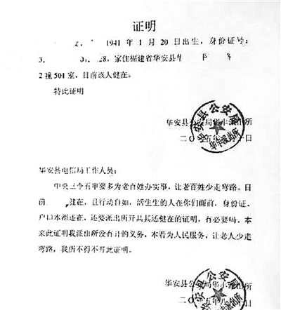 还好好的,却被要求开具《健在证明》。昨日,漳州市华安县一位70多岁的阿婆到电信部门领取遗属抚恤金时,遇到上述情况。华安县华丰派出所一位民警为其所开的证明后所附的内容,在网上引起轩然大波。对此,漳州电信部门解释,要求老人开具证明,是为了避免有人冒领抚恤金,并不是有意刁难老百姓。(8月11日《海西晨报》)