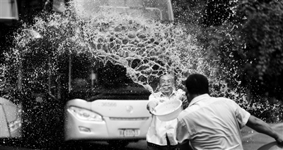天气太热,怎么给职工降温?昨天,公交客三分公司十二车队在清洗场站前组织职工开展打水仗比赛,边泼水边降温,以此防止职工中暑。泼水之后,大家一起开心地清洗场站,既清凉又环保。