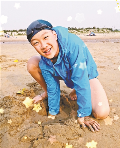 这是我第一次看大海。站在海边,远远望去,大海一望无际,与天空交汇在视界的尽头,消失在一片蓝色中。这里的空气也是新鲜的,好像有一股“水槽”的味道。对于一个在北京生活的孩子,这里就像远离雾霾的世外桃源。