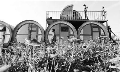 昨天,一群来自城里的“驴友”在延庆县天葡庄园体验“水泥管小屋”,站在天葡海洋馆的观景台上欣赏乡村美景。“天葡海洋馆”是集休闲、趣味、住宿于一体的新型旅游体验宾馆,使用直径达3米的水泥管改造而成,配以外墙彩绘,形成海洋馆风格,满足游客的个性住宿需求。本报记者 陈艺 摄影报道