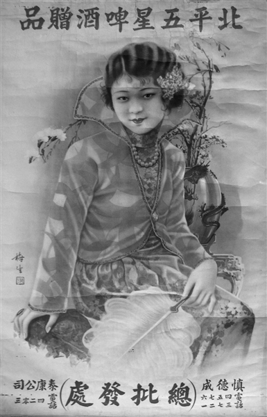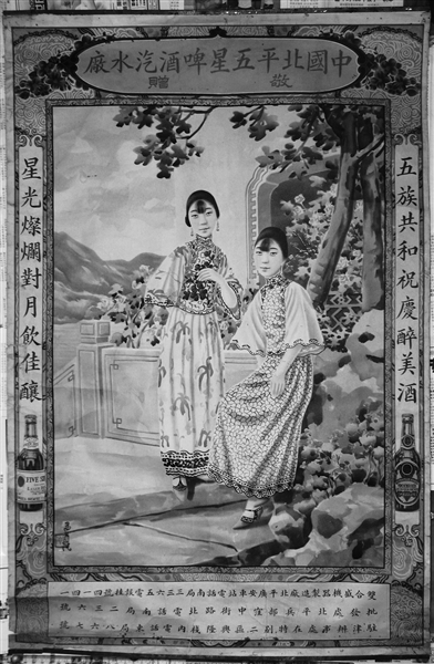 另一张招贴画年代较早,据推断应为1928-1930年间,标题为中国北平五星啤酒汽水厂敬赠字样,画面为两位气质端庄优雅的民国淑女,半依半靠在小桥旁,人物细腻柔嫩、丰满立体而风景自然明朗、清丽妩媚的意境其效果令人耳目一新。落款为曼陀,郑曼陀是清末民初画家以美人画见长。