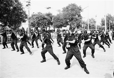 北京市保安服务总公司海淀分公司特勤保安大队训练汇报表演近日举行,海淀区委、海淀公安分局等单位领导观看了表演,同时还引来众多群众驻足观看。此次演出不仅是对保安员的一次岗位练兵,更树立了海淀保安的新形象。图为特勤保安员正在表演擒敌拳。