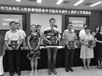 昨天,门头沟区检察院举行附条件不起诉未成年人观护工作现场会,向10余名人大代表、政协委员、劳动模范等社会各界爱心人士颁发聘书,聘请他们成为涉罪未成年人观护员,帮助在附条件不起诉考察期内的未成年人改过自新。 本报记者 任洁 摄影报道