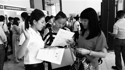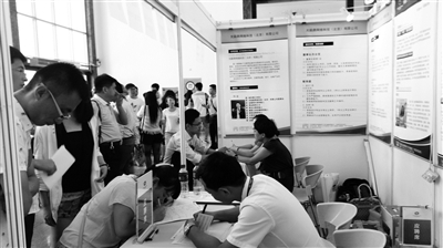 除了毕业生招聘会,以面向有一定工作经验求职者的周末招聘会也随着天气日益升温。8月15日,在农业展览馆的招聘会上,记者就看到了企业为了招揽人才互相比拼福利的场景。而对比企业的热情,求职者的选择余地很大,不少企业的招聘人员都是主动出击,“抢夺”人才,现场销售类、教育类和金融类的企业居多,还有不少来自河北等地的外地企业也来京招揽人才。记者在一家教育类机构的站台前看到,因为提供的待遇比较优厚,前来咨询的求职者特别多,本来只布置了两个现场面试席的企业马上增加了一个面试席,以方便求职者尽快进行现场面试。“现在教育产业发展迅速,企业业务发展很快,急需人才,我们也希望能尽快招募到合适的人才。”这家机构的招聘负责人告诉记者,趁着周末来招聘,有合适的当天面试完毕后,周一就可以上班了。