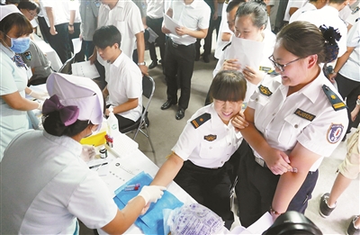 昨天,国家大剧院外,一群身穿保安服的保安员们在有序地进行体检。这些保安员都将服务于“纪念中国人民抗日战争暨世界反法西斯战争胜利70周年”活动。预计涉及近1000名执保天安门、国家大剧院、地铁1、2号线的保安员。当天的体检,包括血常规、肝功能、肾功能、血压、心电图、B超、骨密度和内外科等多项检查。此次免费体检是由北京市保安服务行业工会联合会与首都医科大学附属北京康复医院、中国职工互助保险会北京办事处共同发起。在体检前,这些保安员还参加了如何应对突发事件以及心理方面的培训和辅导。