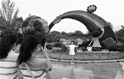 昨天,北京植物园遍植鲜花,又成了花的海洋。围绕抗战胜利为主题布置了“描绘未来”、“绿色卫士”、“珍爱和平”等6组花坛。在位于植物园东南门外的花坛“描绘未来”,是今年花展的一大亮点景观。花坛以彩虹造型为主体,左侧是一只小手幻化成树干,右侧是一个拿着彩笔正在画画的小姑娘。彩虹寓意彩色的童年记忆,小姑娘描绘着的是美好的未来。花坛主体高5.6米,使用了近5万株植物扎制而成。本报记者 邱勇 摄影报道