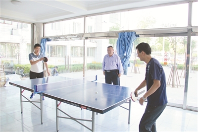 顺义区疾控中心办公空间有限,为了给职工开辟活动场所,中心工会把一起可以利用的资源巧妙的利用起来,大力鼓励和支持职工锻炼身体。比如把一楼的一个储物间布置出来,放置了一个乒乓球案子,还配备检测仪,职工可随时自测血压、血糖、体脂等相关数据。在四楼的职工活动室,小小的空间,跑步机、杠铃、沙袋等健身设施一应俱全,有的还是职工自己带来的,这里无需专人管理,前来健身的职工自觉签到,倍加爱护这里的一切,因为每个职工都把这里当成自己的家。