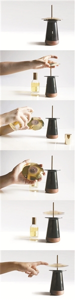 设计师iAN Yen期望以一种优雅的方式使芬芳尽散空中,利用离心的原理以及磁悬浮的概念,使上部的圆盘以近乎零重力的状态浮于底座之上,将精油滴在上面,使其旋转,就可以使得香气弥漫整个房间。