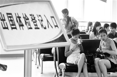 昨天,在北京国际旅行卫生保健中心里,几乎每个科室门口都有等待体检的长队。根据国际通行规则,因留学、劳务等需要长时间在外驻留的人员须向目的地国递交体格检查报告。北京国际旅行卫生保健中心工作人员提醒市民:时下正值出国体检的高峰季,市民尽量提前预约体检。本报记者 孙妍 摄影报道