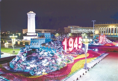 昨天,天安门广场长城主题花坛亮了起来,营造出璀璨夜色。记者在现场看到,华灯初上,“1945”和“2015”两个数字年代景观在红色灯光的映衬下闪耀夺目,雄伟巍峨的长城、展翅高飞的和平鸽、挺拔的苍松翠柏在彩色灯光的映衬下,展现出广场上雄伟壮丽的“长城”夜景。据了解,此次“长城”主题山水花坛总占地3000平方米,分为东西两组,单组东西长60米,南北宽25米,并使用了龙柏、叶子花等大型植物3000株。