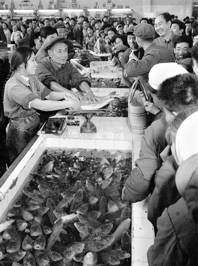 我那时买菜一般是从临长安街的南门进去,逛完了从再开在东单北大街的东门出来。(这里现在正是标志“银街”漂亮牌楼的位置)。菜市场大厅是弧形高顶,铁屋架支撑,墙上大玻璃窗,大厅里分外豁亮。正面蔬菜货架上用圆白菜,绿叶菜,黄胡萝卜等各种颜色蔬菜组成的图案,长有30多米,高有3米多,非常好看。每到节日,还会拼成庆祝五一、十一等字样。靠西墙是牛羊肉部,卖肉的是一位姓马的老回民,说话和气,手头特别麻利。南面是大肉部,东面是卖油盐酱醋等副食品的柜台。大厅中间有几个水产池子,都贴着白瓷砖,里外刷得十分干净,里边的鱼、虾、蟹等看着特别鲜活。我第一次看见宰杀鳝鱼的,就在这里。售货员用锥子把鳝鱼头钉在案板上,在蛇颈处用刀割个口儿,用手把鱼皮一捋,拿刀尖顺着鱼身一划,鱼身就成了一大片儿,再一划,鱼骨就剥离了,洗干净切成段儿交给顾客,那叫一个利落,煎炒烹炸您回家自个儿忙活去吧。大厅里还有卖糖果点心,烟酒副食,蔬菜水果,活鸡活鸭,品种相当齐全,家里来了客人,您只要在这儿转一圈,什么也不缺了。菜市场的售货员都统一穿着白大褂,或系着蓝围裙,待人诚恳,买卖公道。记得有一次我让女儿去买一斤牛肉,那时牛肉每斤六角五,羊肉每斤七角一,女儿买回牛肉告诉我是按羊肉收的钱。过了几天我又去买菜,顺便跟一位卖肉的售货员提起此事,没料到,他不但退我六分钱,还连连向我道歉赔不是,老北京商家那种诚信待人的经商之道让我十分感动。