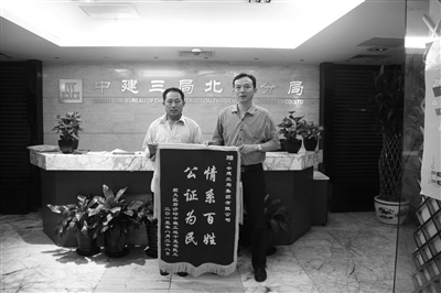 8月31日,来自河南的农民工班组长徐东亭起了个大早,4点钟从北京城郊出发,转了大半个北京城,来到了中建三局三公司北京分公司机关,将“情系百姓 公正为民”的锦旗交到分公司党委副书记、纪委书记、工会主席程亚军的手上。