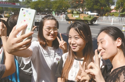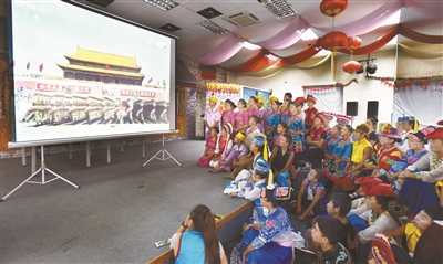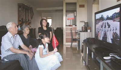 昨天上午,中国人民抗日战争暨世界反法西斯战争胜利70周年纪念大会在天安门广场隆重举行,并举行盛大阅兵式。广大市民热切关注。在中华民族园,来自祖国各地的少数民族职工聚集在职工活动中心,认真观看抗战胜利日大阅兵转播盛况;在潘家园小区,林松老人一家祖孙三代观看电视直播。同时,市民用多种方式目睹阅兵盛况。本报摄影记者用镜头记录了首都职工和群众观看胜利日大阅兵的情景。