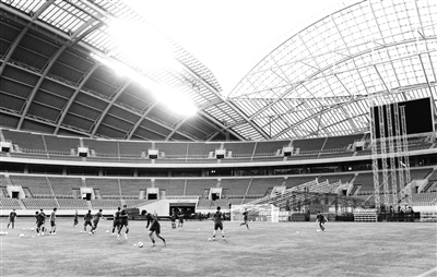 在沈阳奥体中心与国足训练同时间进行的还有周杰伦演唱会舞台的搭建工作,国足众将们就在一个个铁架之间完成训练。由于沈阳奥体中心最近的活动太多,草皮质量不高,场地坑洼不平,这着实让主教练佩兰头疼。