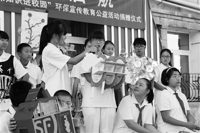 用废旧的报纸折叠成一条百褶裙,旧光盘串起来的外套穿在身上神采奕奕……北京宏志中学昨天举办绿色环保主题开学典礼。学生们纷纷展示自己用废旧物品做成的盆景、笔筒等,上演了一场环保达人秀。通讯员 张道新 梁屹 摄影报道